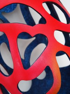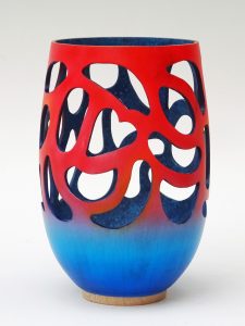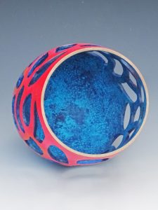 The sycamore grain was very plain, so I decided to add colour. An airbrush was used for the outside, starting with blue, darker at the base and lighter further up, where it was blended with the red. Acrylic blue paint was applied by brush to the inside surface and to the inside perimeter of the voids. Darker blue was then applied with a sponge to provide a contrasting fleck appearance.